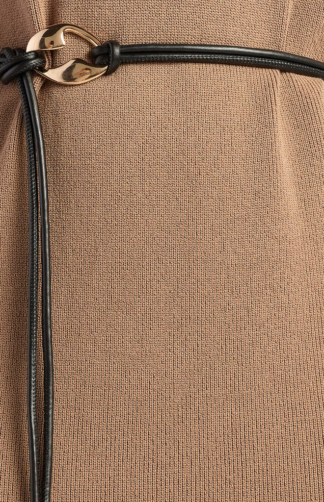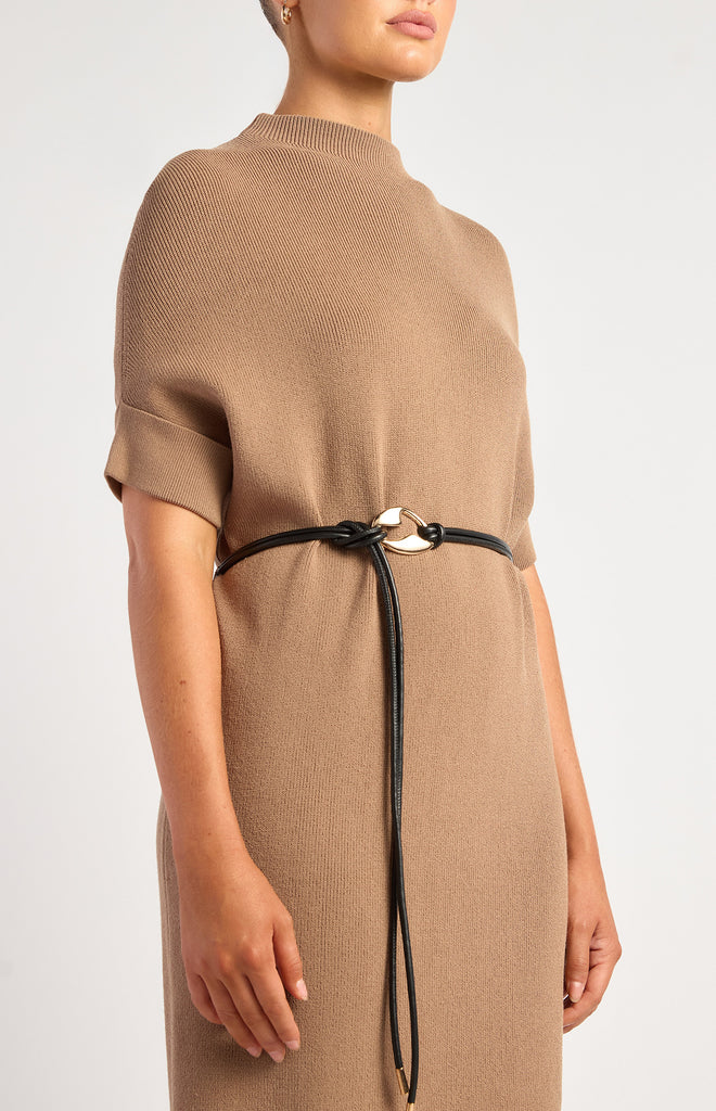 The Banks Knit Dress is the perfect balance of effortless polish and everyday comfort. Crafted from a beautifully soft stretch knit, this relaxed midi dress skims the body with ease while still feeling light and breathable. The high neckline and softly structured short sleeves with folded cuffs create a modern, refined silhouette, while the removable faux leather rope belt adds a subtle touch of texture and shape when you want it.