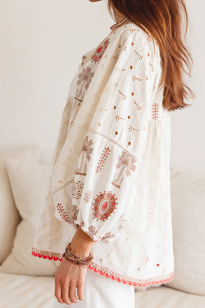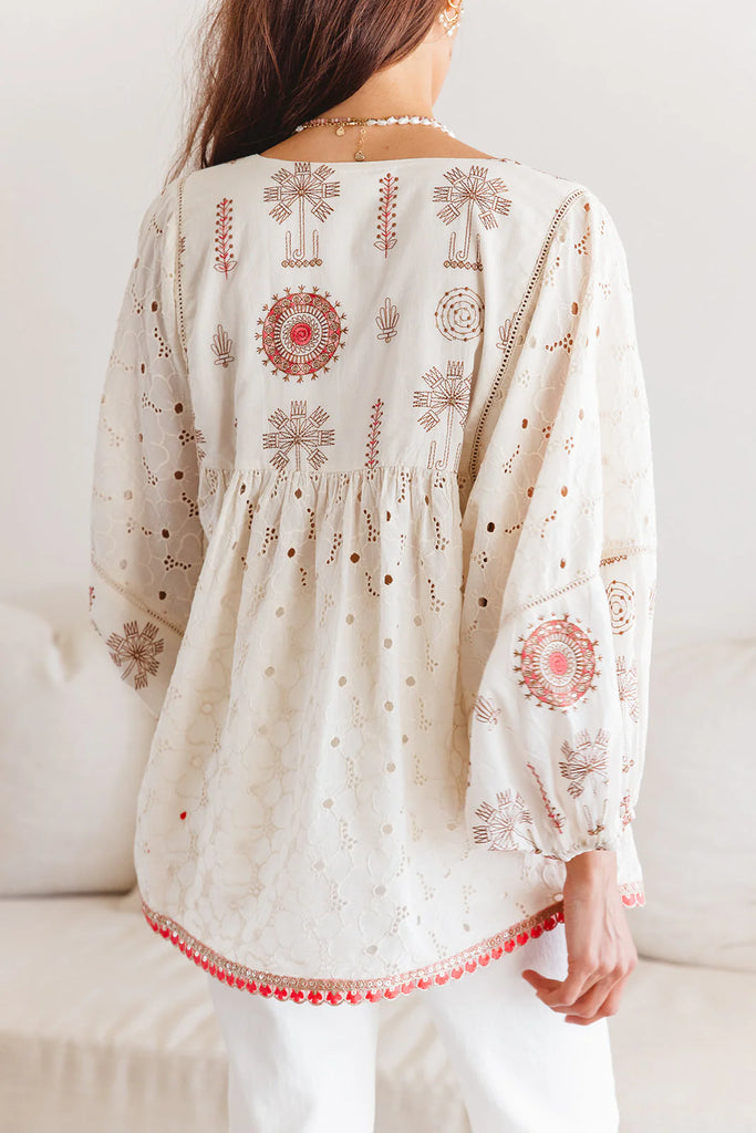 The Byron Top is where artisanal craft meets effortless boho style. A dreamy fusion of soft cotton schiffli and intricate temple embroidery, this top feels as good as it looks. The relaxed, floaty silhouette and gathered bodice offer a flattering, feminine shape, while the subtle cutwork and contrast tassel ties bring a playful edge. Perfect with white denim, linen shorts, or layered over swim, the Byron Top is a piece you’ll wear on repeat all season.
