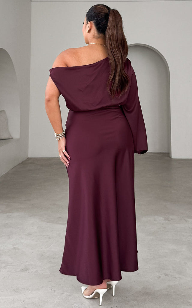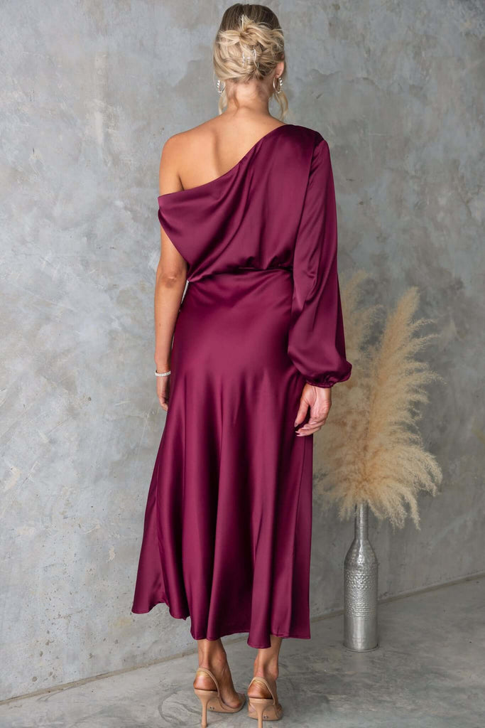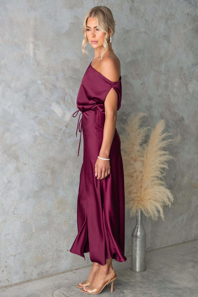 Step into effortless sophistication with the Ebony Bay Dress, a timeless wine drop shoulder midi dress designed for both day and night. Crafted with a sleek silhouette and asymmetric neckline, this versatile piece blends comfort with modern elegance.