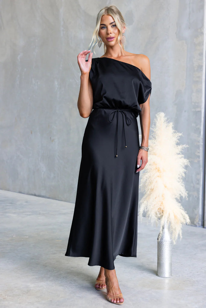 Designed in Australia, the Jordan Maxi Dress brings effortless elegance to any occasion. Crafted from soft satin, this asymmetric one-shoulder silhouette drapes beautifully and moves with grace. The removable fabric tie cinches the waist for a flattering shape, while the invisible side zip ensures a seamless finish.