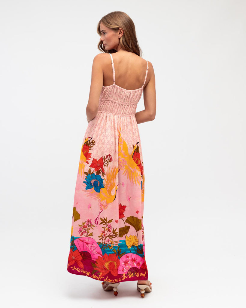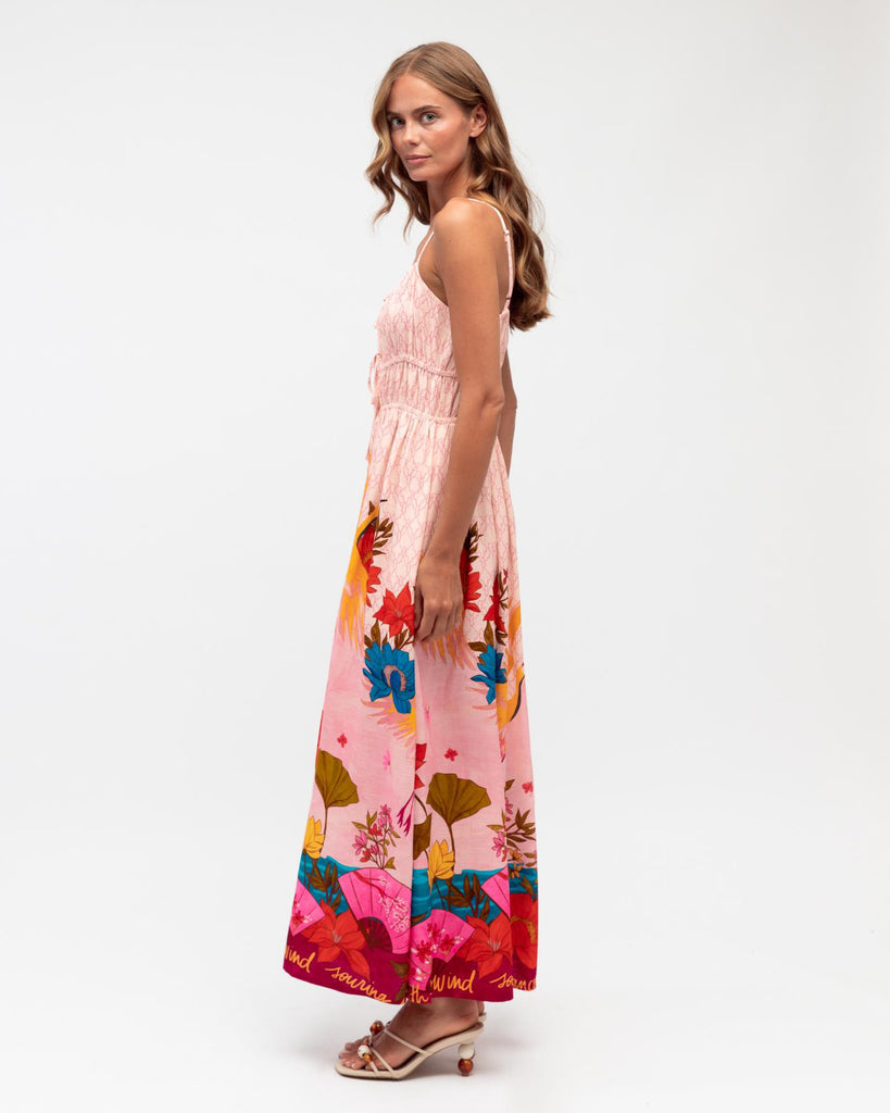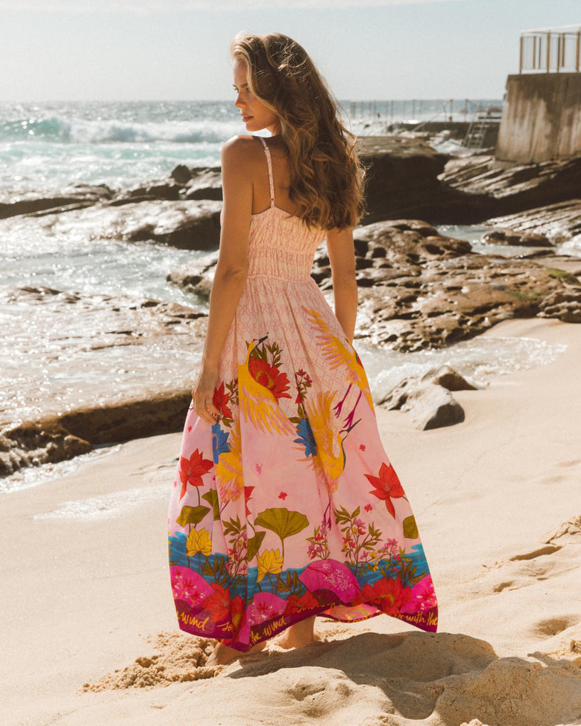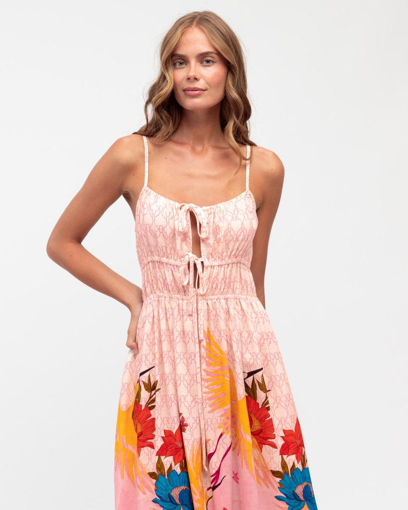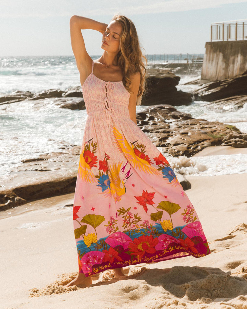 Embrace effortless summer elegance with the Leelani Summer Maxi Dress, crafted from luxuriously soft linen-rayon fabric designed in Australia. Featuring delicate shoestring straps and a charming tied-front detail, this flowing maxi showcases a playful tropical print that is both romantic and feminine. Complete with practical side pockets, it’s the perfect dress for daytime adventures or a seamless beach-to-bar look. Soft, breezy, and effortlessly chic, the Leelani Summer Maxi Dress is a must-have for your summer wardrobe.