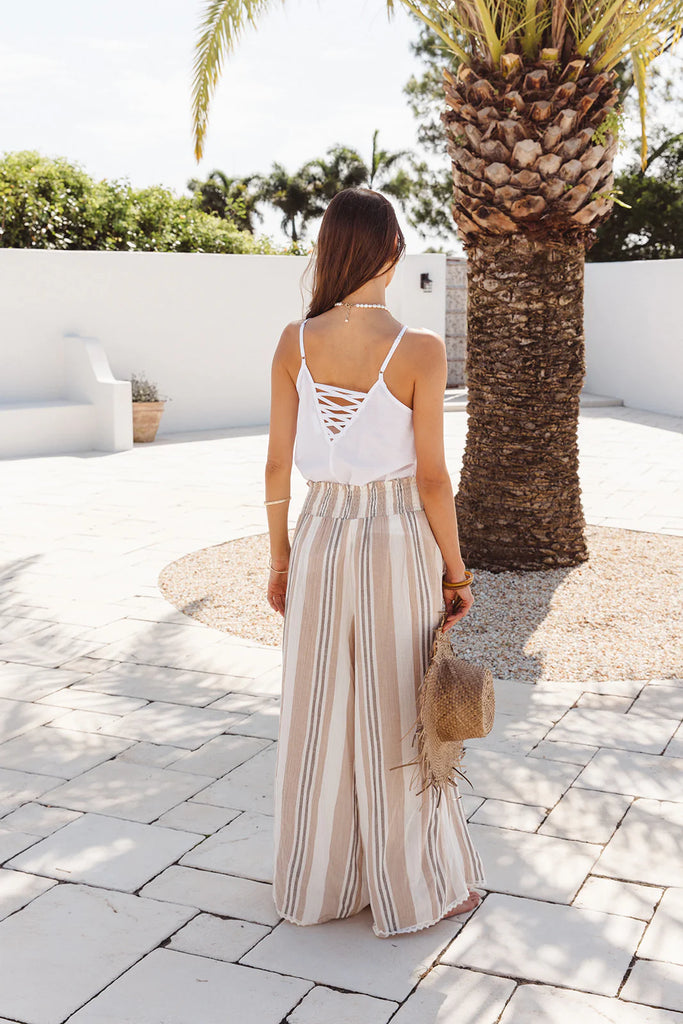 With their relaxed silhouette and smocked waistband, the Palmas Pants pair beautifully with simple tanks, oversized shirts, or resort-ready blouses. Whether you’re strolling cobblestone streets, lounging by the pool, or dressing them up for an evening out, they’ll quickly become your go-to for laid back sophistication.