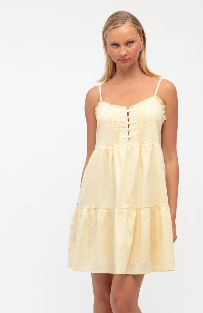 Meet the Sorrento Mini Dress — sun, sand and summer wrapped into one effortless style. Crafted from a beautiful lightweight yet luxe linen–cotton blend, this feminine mini is softly lined with sheer rayon for breathable comfort. Delicate spaghetti straps frame the bodice, while fabric-covered buttons and intricate pin-tuck detailing add a refined, romantic touch.