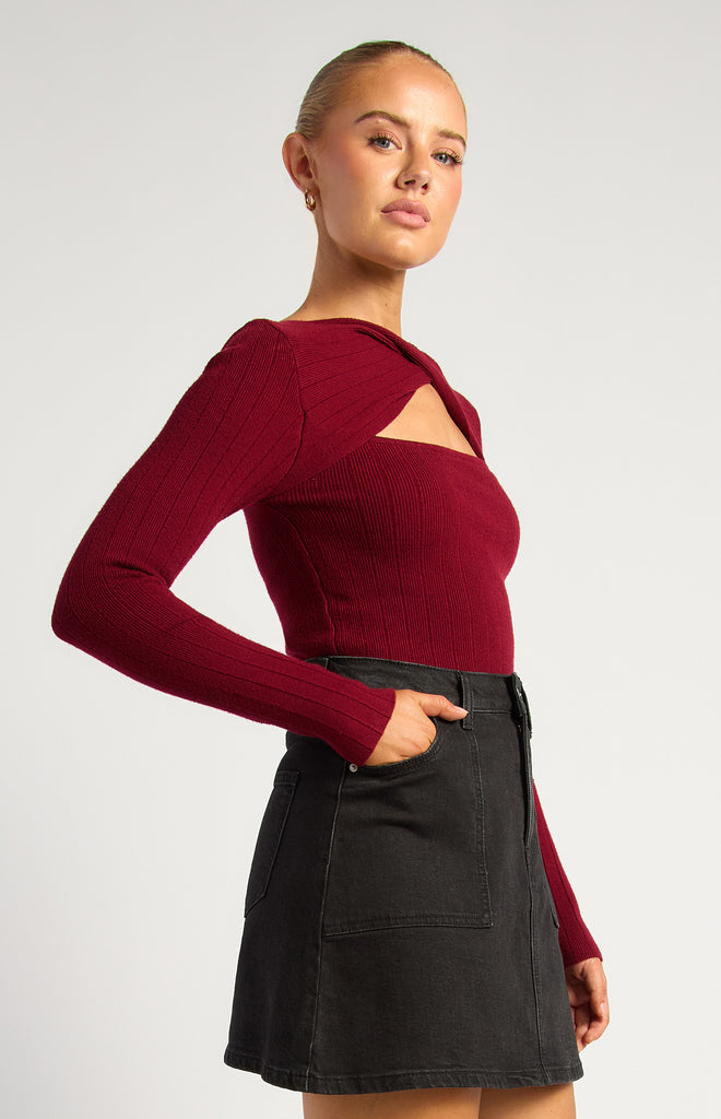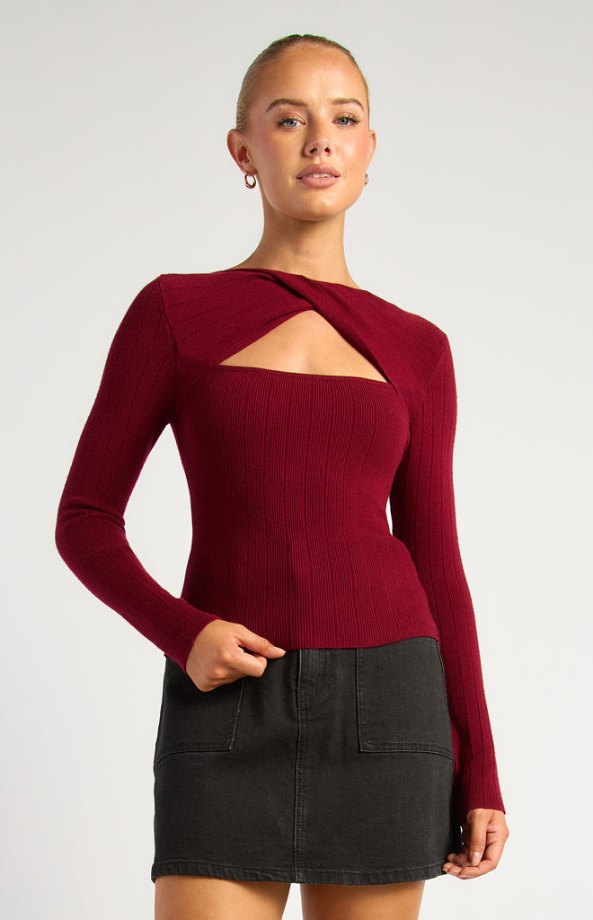 Meet your new go-to top: the Taylor Knit. Designed in Australia, this wide ribbed, stretchy knit fits like a dream, hugging your curves while keeping you super comfy. The front twist neckline with a playful cut-out adds just the right amount of flirty detail – perfect for date nights, brunches, or nights out with your squad. Long sleeves and a fitted silhouette make it effortlessly chic, while the rich burgundy shade brings warmth and sophistication to your look. Pair it with high-waisted jeans, skirts, or your favourite statement accessories for a vibe that’s fun, bold, and totally you.