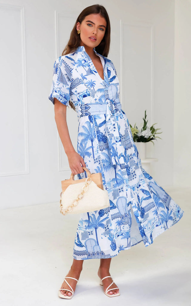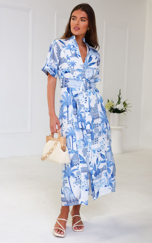 Designed in Australia, the Wallace MIDI Dress is a perfect blend of effortless style and comfort. Made from a soft, lightweight polyester-rayon blend, this fully lined midi dress showcases a striking blue and white tropical print. It features short cuffed sleeves, a collared button-down front, and a self-tie waist belt for a flattering silhouette. The relaxed A-line skirt falls gracefully to mid-calf, making it an ideal piece for warm days, coastal escapes, or casual chic gatherings.
